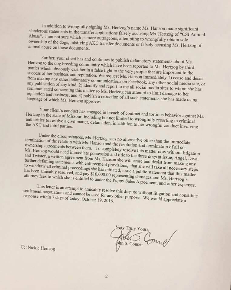 John Connor, who defendant hired to write a letter directing me to "cease and desist" posting on social media about Diva. Connor wrote to send defendant $10,000 because of my social media posts. Even wrote that his client, the defendant was claiming ownership on Diva, Twister and Angel and to turn them over because she was entitled to them. Did not mention if Diva was alive...