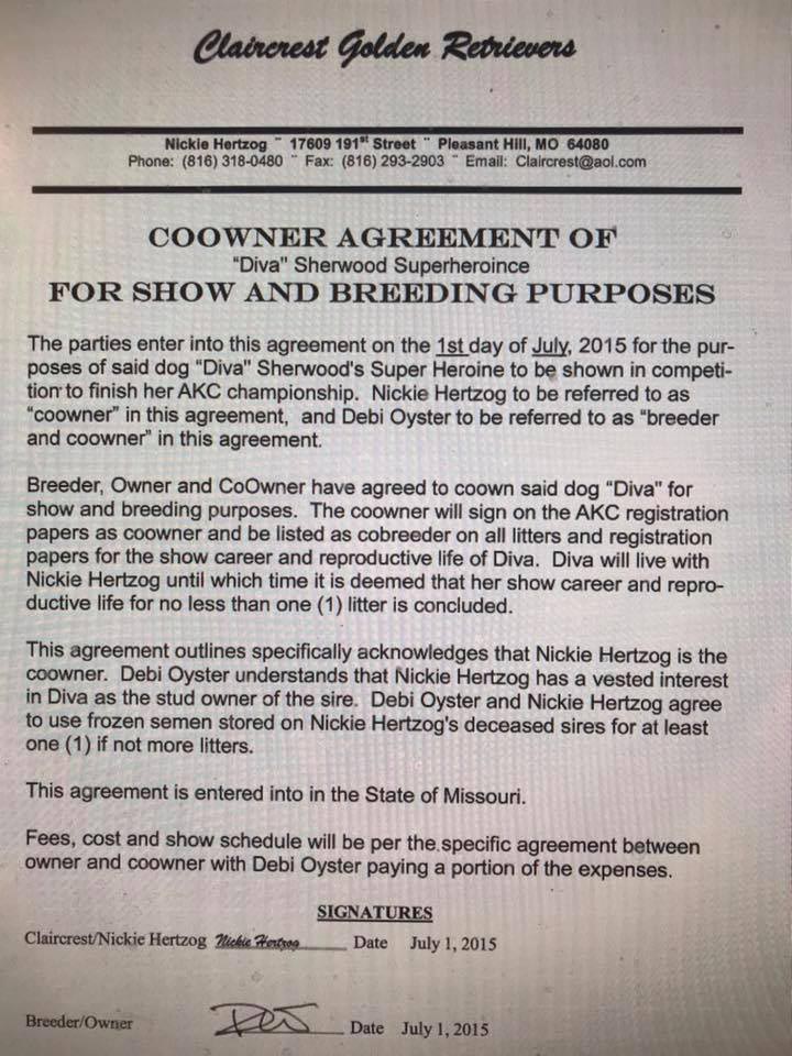 WHO would sign a co-ownership agreement allowing someone else to dictate terms and breeding rights of a dog YOU OWN and BRED on their own letterhead?
