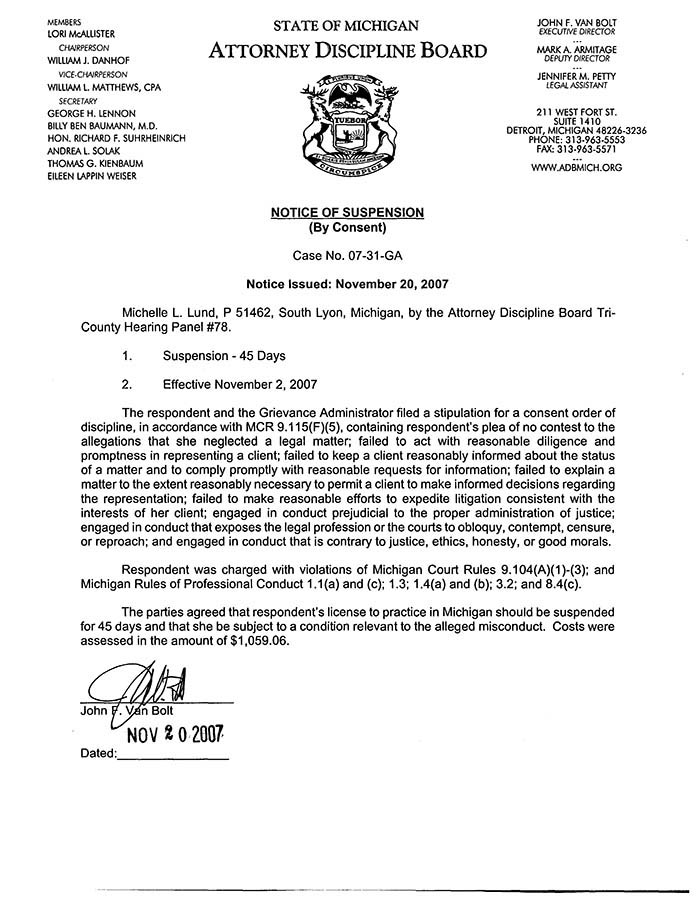 The defendant testified under oath that she hired Radloff, an attorney in Michigan. Radloff prepared legal documents that the defendant herself filed with an Idaho court. Further investigation (I missed my calling on being a private investigator) revealed Radloff was previously SUSPENDED FROM THE MICHIGAN STATE BAR... Radloff plead no contest that she neglected a legal matter; failed to act with reasonable diligence and promptness in representing a client; failed to keep a client reasonably informed about the status of a matter and to comply promptly with reasonable requests for information; failed to explain a matter to the extent reasonably necessary to permit a client to make informed decisions regarding the representation; failed to make reasonable efforts to expedite litigation consistent with the interests of her client; engaged in conduct prejudicial to the proper administration of justice; engaged in conduct that exposes the legal profession or the courts to obloquy, contempt, censure, or reproach; and engaged in conduct that is contrary to justice, ethics, honesty, or good morals.
