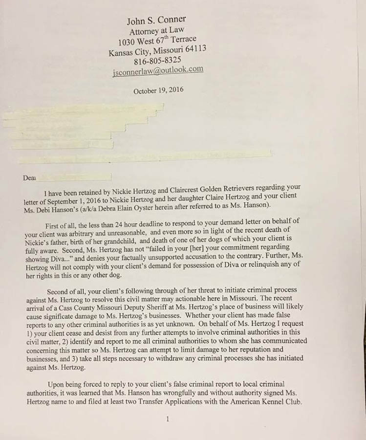 John Connor, who defendant hired to write a letter directing me to "cease and desist" posting on social media about Diva. Connor wrote to send defendant $10,000 because of my social media posts. Even wrote that his client, the defendant was claiming ownership on Diva, Twister and Angel and to turn them over because she was entitled to them. Did not mention if Diva was alive...