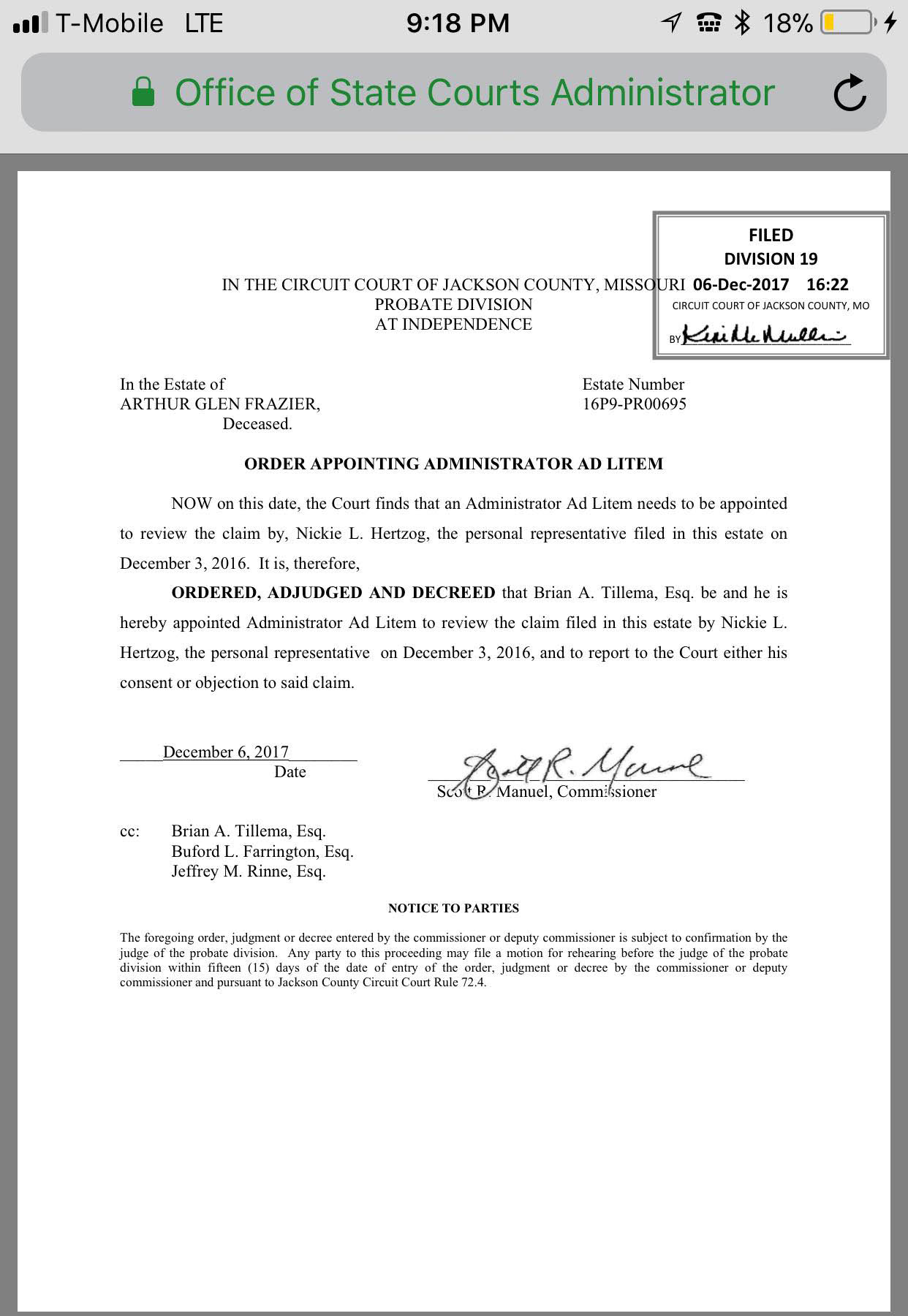 Jackson County Missouri Probate judge JUST appointed an independent attorney to act as a probate administrator to look into claims that the defendant presented fraudulent documents to gain an advantage in the PROBATE COURT.