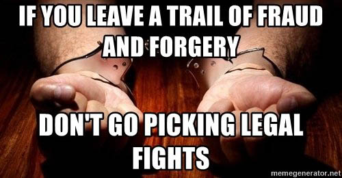 Forges MY name on a co-ownership agreement and presents this fraudulent document to gain advantage in a civil suit.